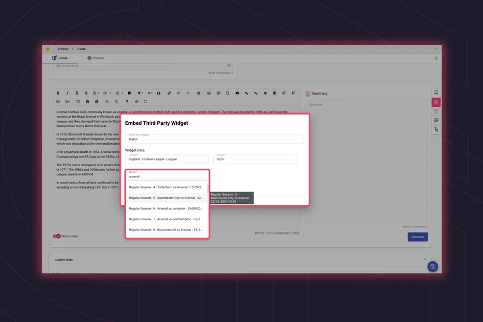 Third-Party Widgets can be placed across content components - Articles, Collections, Templates, and Live Reports - which gives editorial teams the same flexibility wherever they're working. So a widget used in a standard article can be reused in a Live Report for example.