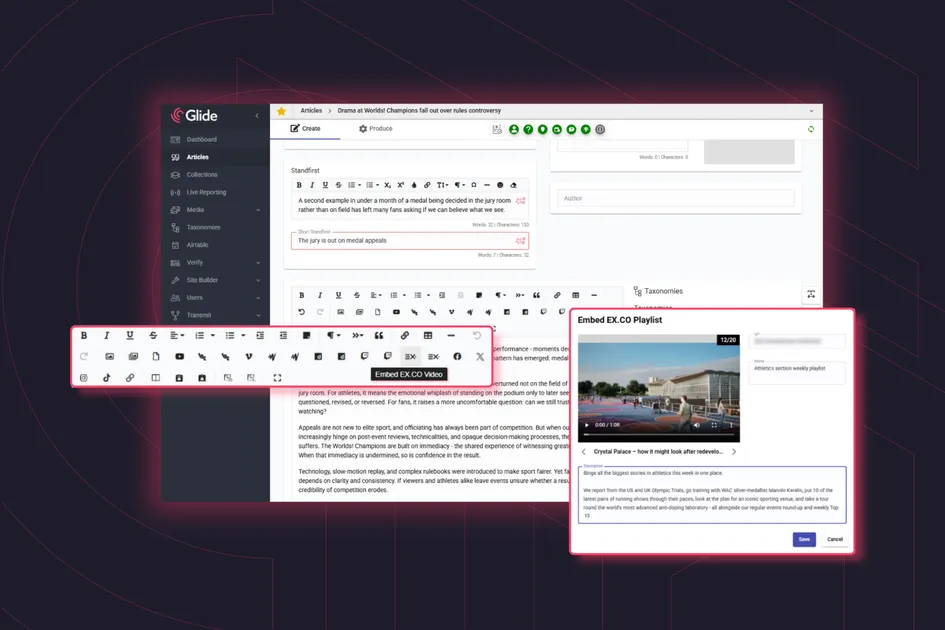 With EX.CO fully embedded into Glide CMS, video becomes a natural, scalable part of the editorial process, not an extra task to manage. The result is a unified workflow that connects content creation through to recommendations and monetisation, turning editorial efficiency into a strategic advantage for engagement and revenue growth. One workspace, one interface, fewer steps, and far less opportunity for errors so editors and content teams can focus on what they do best: telling great stories enriched by video.